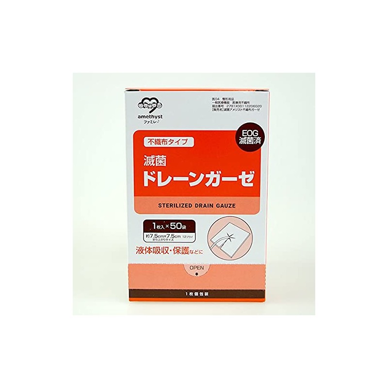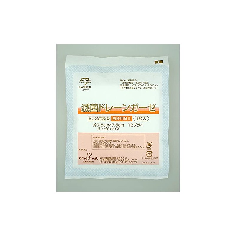 アメジスト ワンウェイ滅菌ドレーンガーゼ 7.5cm x 7.5cm 12層 個包装 50枚入り 大容量