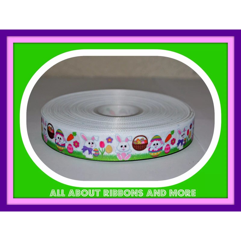 7/8 INCH EASTER BUNNY ON GRASS WHITE GROSGRAIN-1 YARD