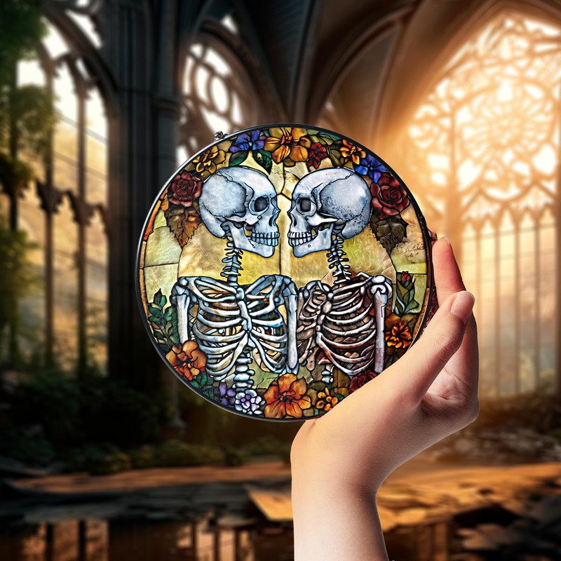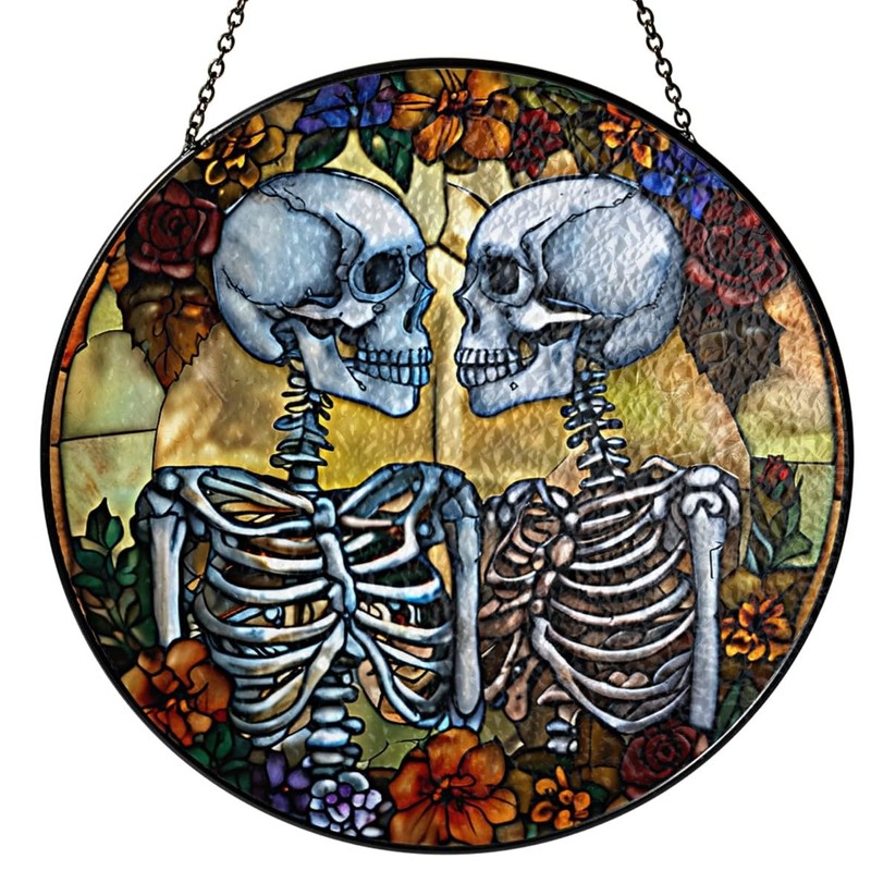 7.8" Skulls Couple and Flowers Stained Glass Suncatchers Art Glass Skeleton Sun Catcher Indoor Window Gift for Gothic Nature Floral Lovers Women Mom Friend Painted Glass Panel Décor ART-01E-SG8