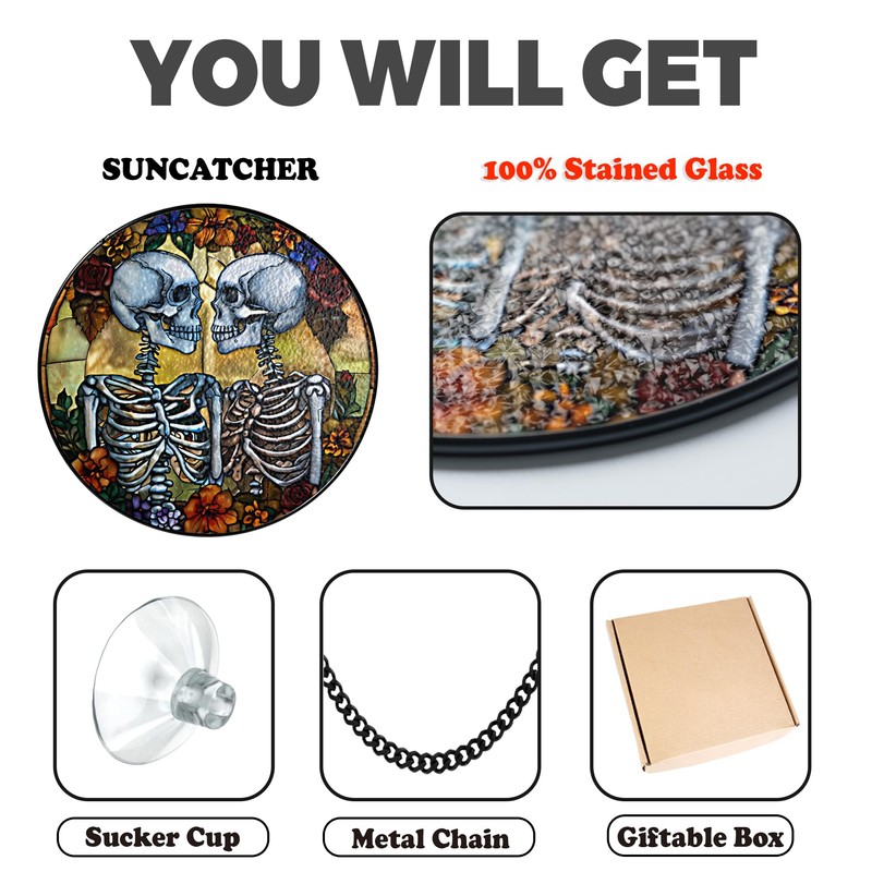 - 100% Stained Glass Suncatcher: This 7.8" suncatcher of skull couple is a very pretty. This blend adds a gorgeous sparkle when sunlight hits, enhancing your home's charm. It accents your window without overpowering it, allowing you to enjoy the view and spot real skull couple and flowers. The bright colors capture the sunlight beautifully. It is real glass, NOT PLASTIC OR ACRYLIC.