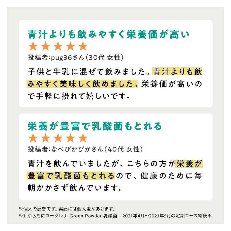 - 【ユーグレナ含有量】10億個 (1,000mg)/本 【原材料名】有機大麦若葉粉末 (国内製造)、ユーグレナグラシリス、イヌリン (食物繊維)、有機明日葉、ガラクトオリゴ糖、クロレラ、乳酸菌 (殺菌)、酵母エキス、デキストリン/香料