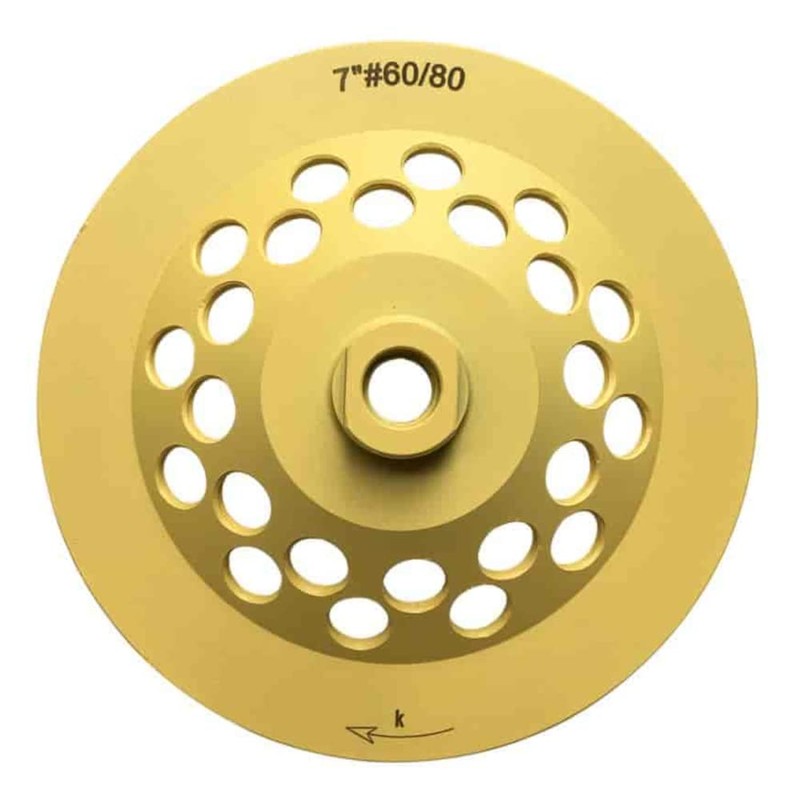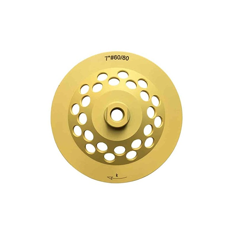 Designed to remove uneven spots and profiling edges on granite, marble, stone and concrete. All cup wheels are custom balanced for accurate performance, with no bounce or chatter that can cause chipping. Specifications: DIAMETER - 7" diameter GRIT SIZE - #60/80 grit ARBOR SIZE - 5/8"-11 threaded arbor CUTTING METHOD - wet or dry EQUIPMENT TYPE - use with angle grinders