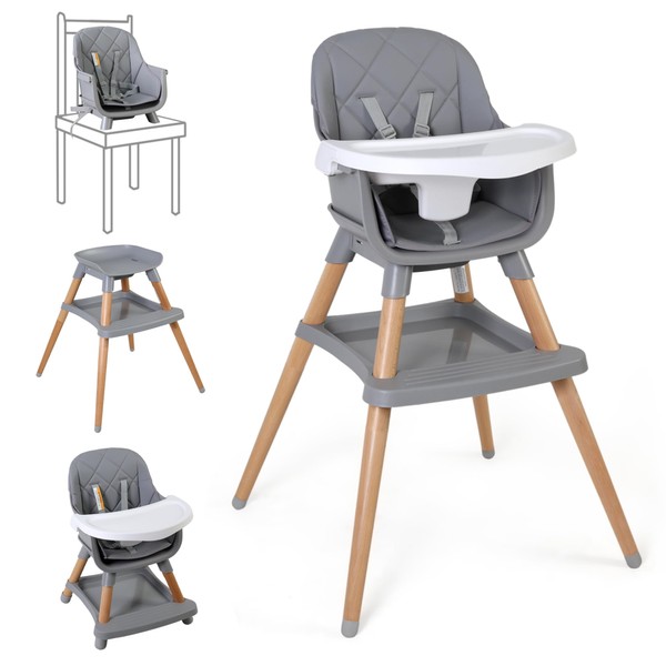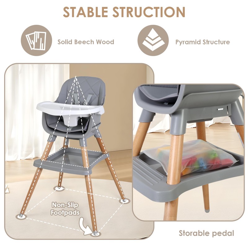 - Safe, Stable & Sturdy: Made from natural beech wood and high quality non-toxic food-grade PP material, our high chair provides a strong support with the firm pyramid structure while the removable 5 point harness and the fixed baffle hold baby for play and mealtime activities. Each mode stands stably on 4 non-slip chair foot pads.