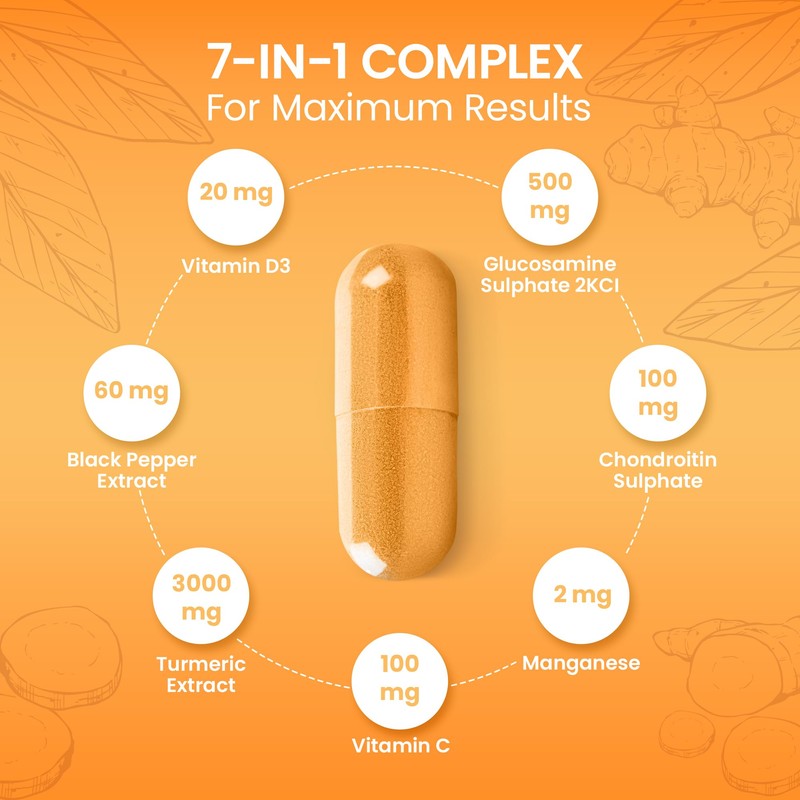 7-in-1 Turmeric and Black Pepper Capsules with Glucosamine and Chondroitin High Strength | Two per Day, 2 Month Supply | Turmeric Capsules High Strength 3000mg, Glucosamine Sulphate & Turmeric Tablets