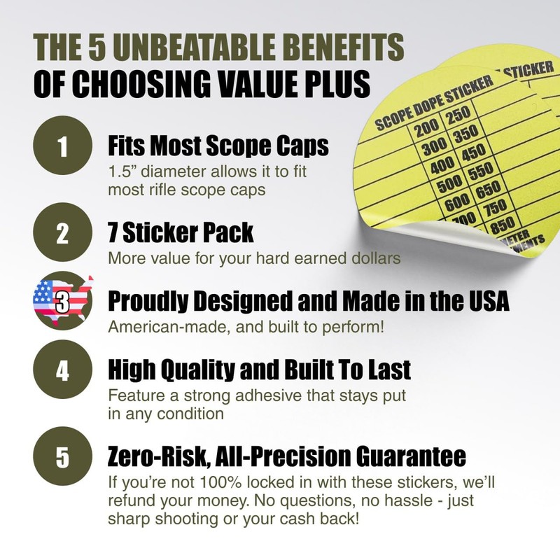 - Proudly Made & Designed in the USA – Built for serious shooters, the Value Plus scope turret stickers deliver top-tier quality. Pair them with your range finder card for unmatched precision. American-made, and built to perform!