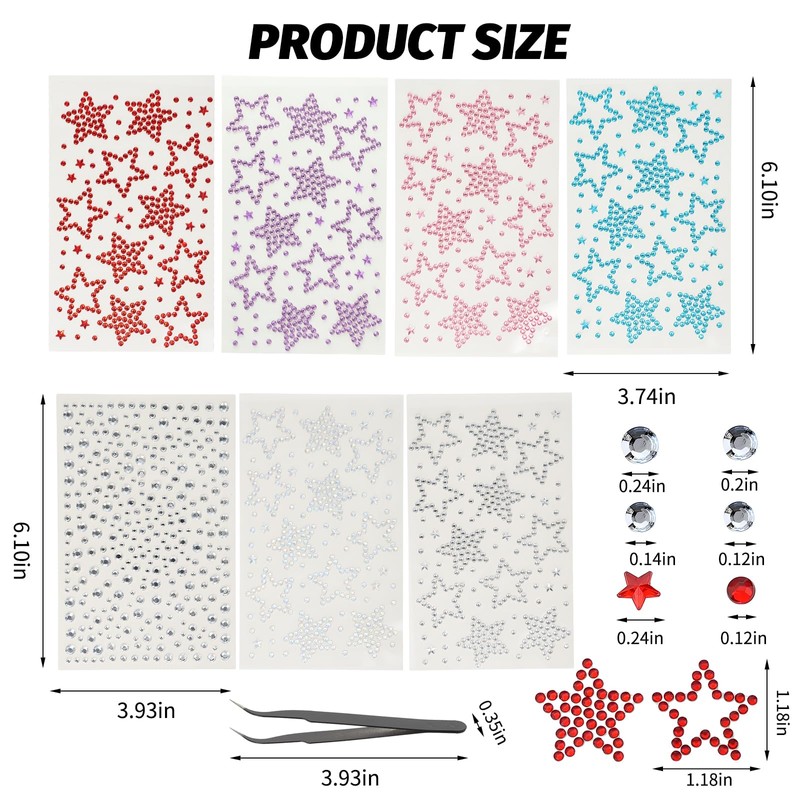 - Fashionable and Sparkling: This gem stickers contains 6 pieces of face gem stickers in different colors, including silver, aqua, AB fantasy, red, purple and pink, and one piece of silver diamond sticker. gem stickers is not only colorful, but also uniquely designed, which can add infinite brilliance to your makeup. It also comes with a pair of tweezers for your convenience.