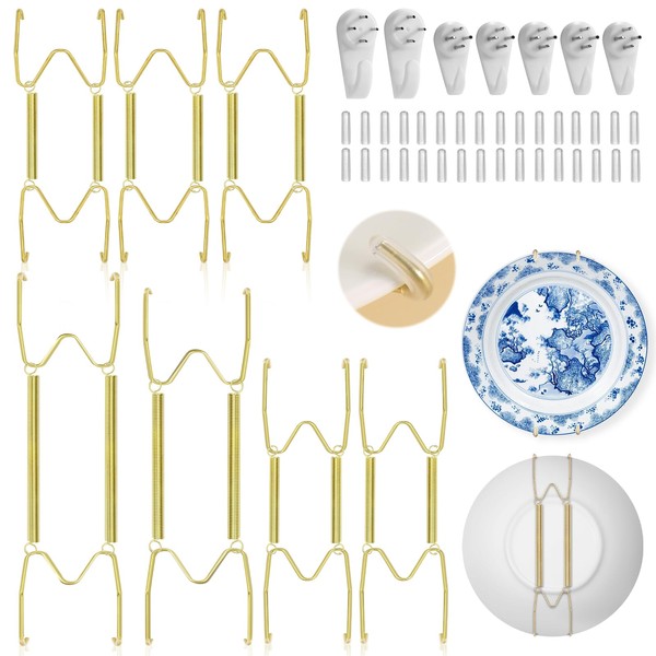 7 Pieces Plate Hangers for Wall - 6/8/10/12 Inch Invisible Plates Hanger, Stainless Steel Plate Holders with 7 Pieces Wall Hooks for 5.5 to 12.5 Inch Decorative Plates and Arts (Gold)
