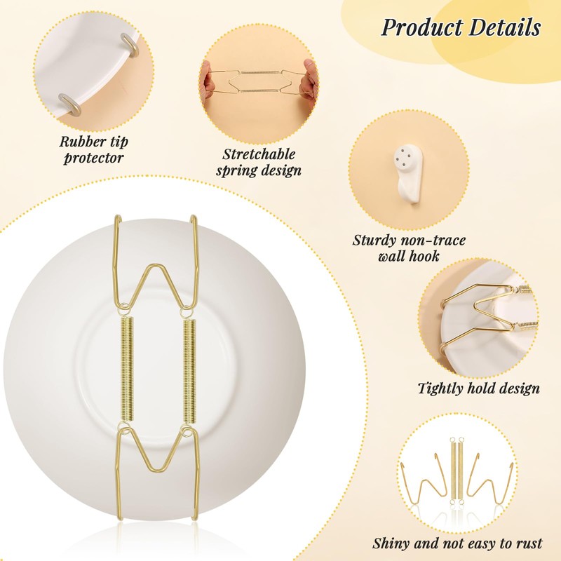- 【Made of Premium Materials】: Our invisible plate hangers are made of stainless steel with golden plated on the surface, shiny and not easy to break or rust. The rubber tip protector protects your plate from scratches. The adjustable spring design holds the plate tightly without fear of it slipping out, and the non-trace wall hook is sturdy and very easy to hammer them into the wall to hang your decorations