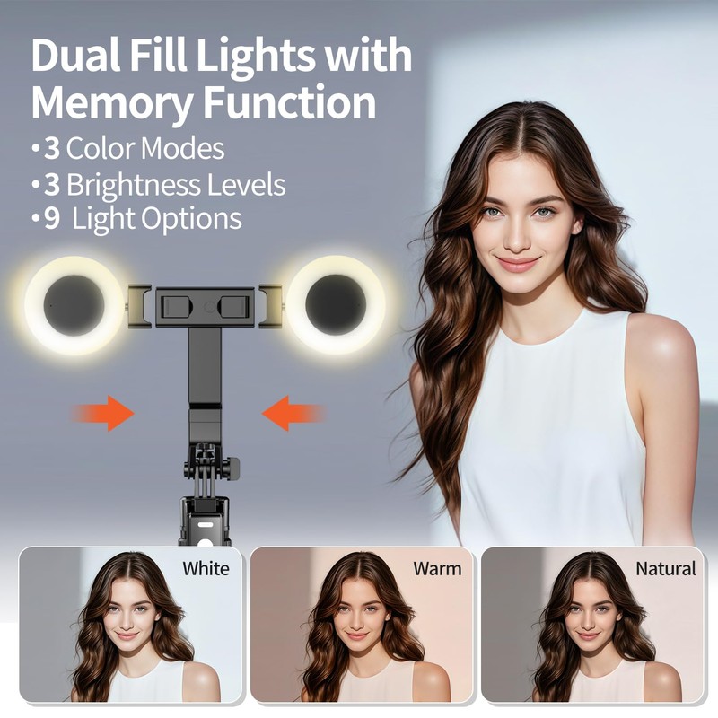 - 【Motion Tracking Tripod with 2 Lights】 This auto face tracking phone holder comes with 2 detachable ring lights, which you can install according to your needs. The tripod for cell phone with light has 3 color modes (cold, natural, and warm), and each mode has 10 levels of brightness. When you use this moving tripod for video recording in dim light, you can attach a ring light to improve the light quality