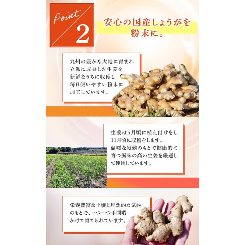 - 【安心の国産しょうが】九州の豊かな大地で育てられた最高品質の生姜を使用しています。土壌豊かな環境で丹精込めて育てられた生姜は、成熟するまでしっかりと手間暇をかけて大切に育てられ、風味が高く品質の良い生姜のみを厳選して収穫します。
