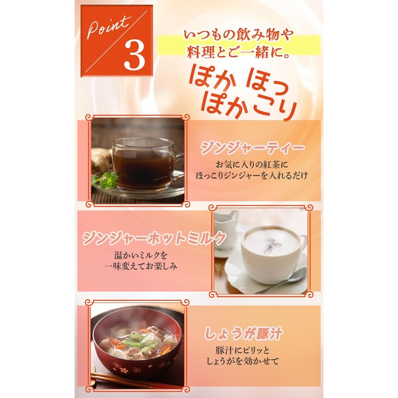 - 【飲み物やご飯と一緒に】毎日の食事にひとさじの温もりを。いつもの料理や飲み物に簡単に加えることができ、その豊かな風味と温もりを皆様の食卓にお届けします。ジンジャーティー、ジンジャーホットミルク、しょうが豚汁など、様々な飲み物や料理にご使用いただけます。