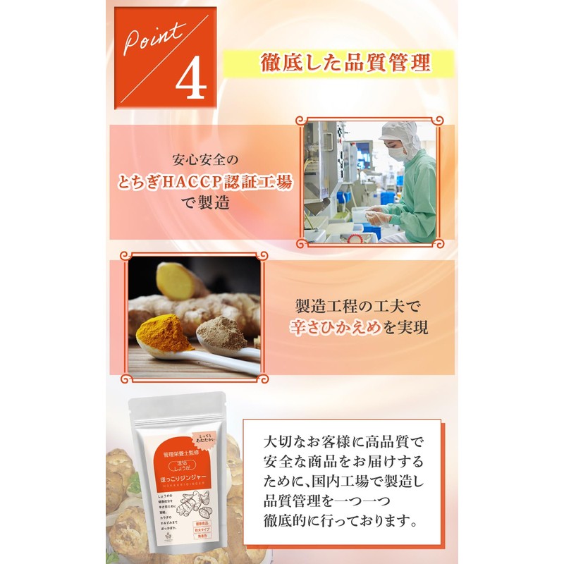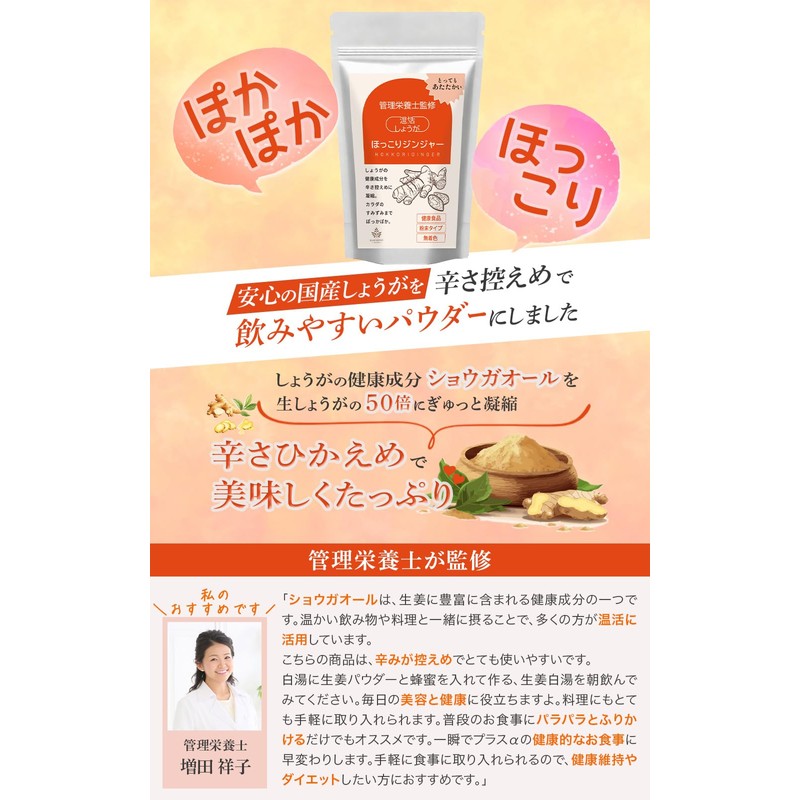 - 【ショウガオールを凝縮】しょうがの健康成分であるショウガオールを生しょうがの50倍に凝縮しています。辛さひかえめなので美味しくたっぷり召し上がれます。温かい料理や飲み物と一緒に摂ることで体がぽかぽかしてくる事を感じていただけます。