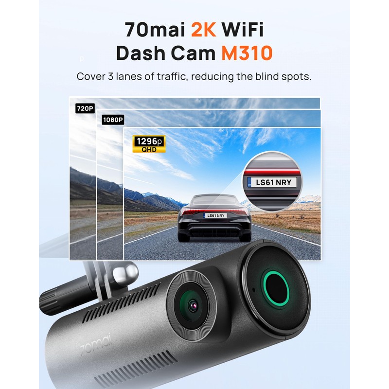 - 【1296P QHD & 130° Wide-Angle FOV】Equipped with a 3-megapixel camera, the 70mai Dash Cam M310 records in 2304 x 1296P HD high resolution, featuring almost 1.5 times clearer than the standard 1080P dash cams. The 70mai Dash Cam M310 can easily capture license plates, road signs, and other critical details on the road. With 130° wide-angle FOV, this dash cam enables you to monitor more lanes with fewer blind spots