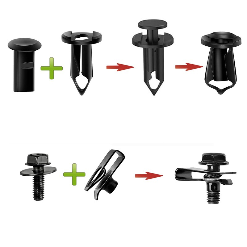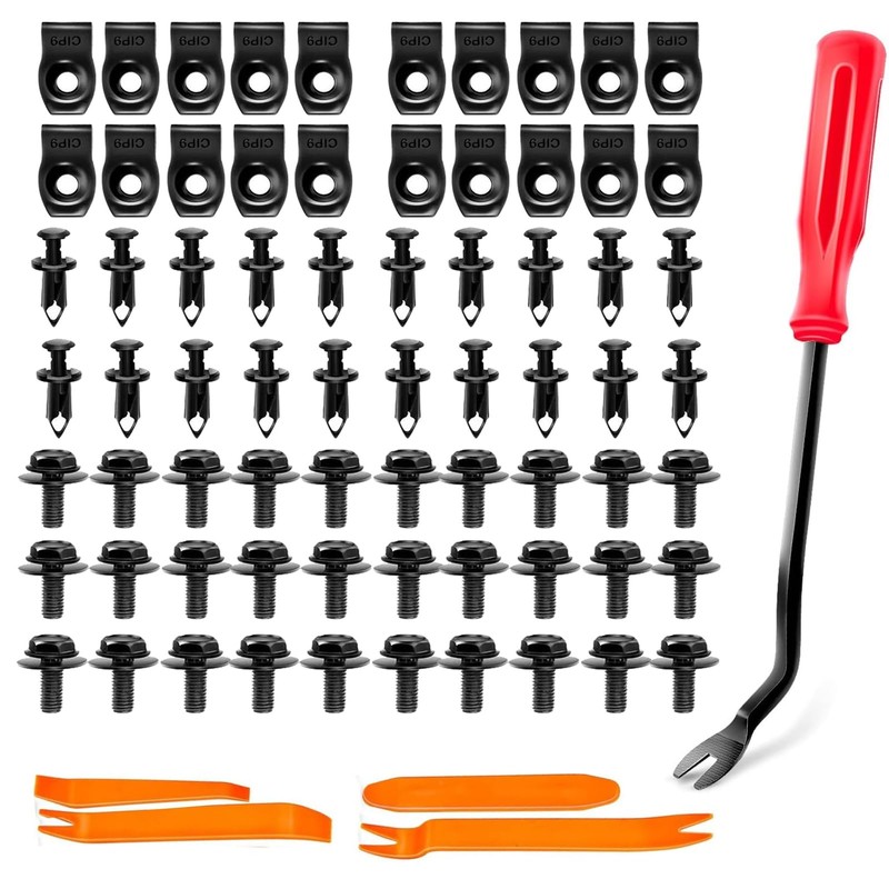 - Package include: 30Pcs body bolts with built-in fender, 20Pcs extruded u-nuts, 20Pcs fender clips, 5Pcs fastener remover tools