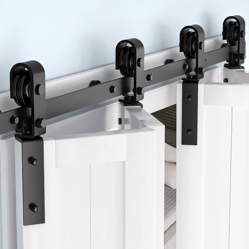 • User-Friendly Installation with Comprehensive Hardware​​: Pre-drilled holes and step-by-step instructions simplify installation, enabling DIY setup in under an hour. The kit includes essential components: 2x 36" rails, 4x heavy-duty rollers, 6x hinges, and floor guides, ensuring secure anchoring on wood or concrete surfaces. Optional mounting brackets accommodate custom configurations for doors up to 1-3/4" thick.