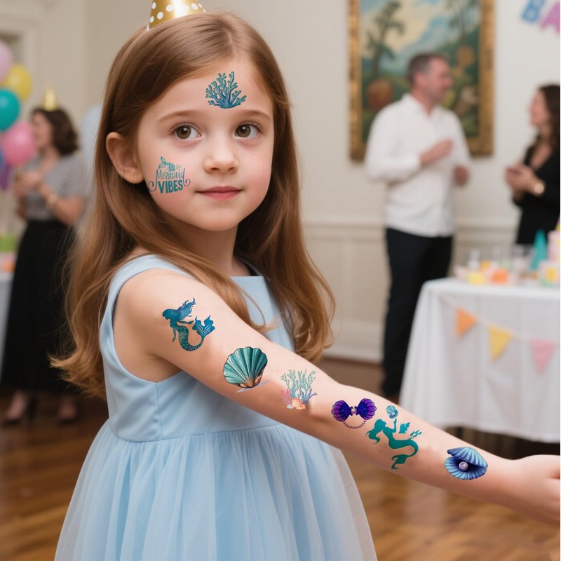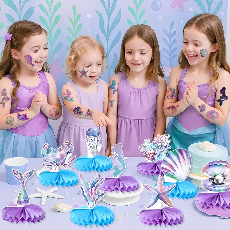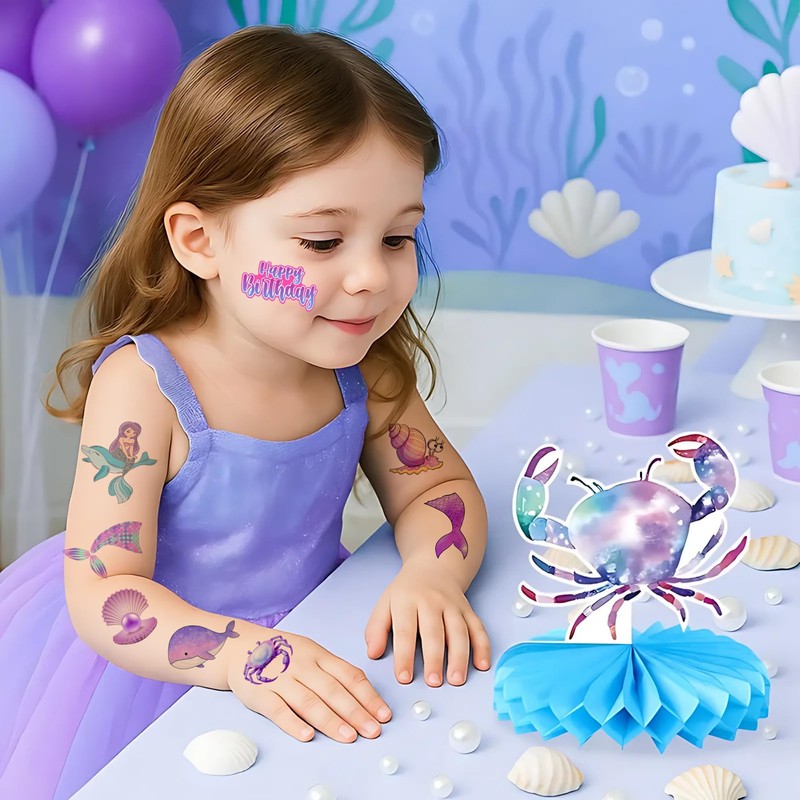 - Package Includes: 6 sheets mermaid temporary tattoo, total 72PCS different designs mermaid and under the sea tattoos stickers. The sheets measures 6.2 inch X 4.5 inch, enough to use and share with your friend.