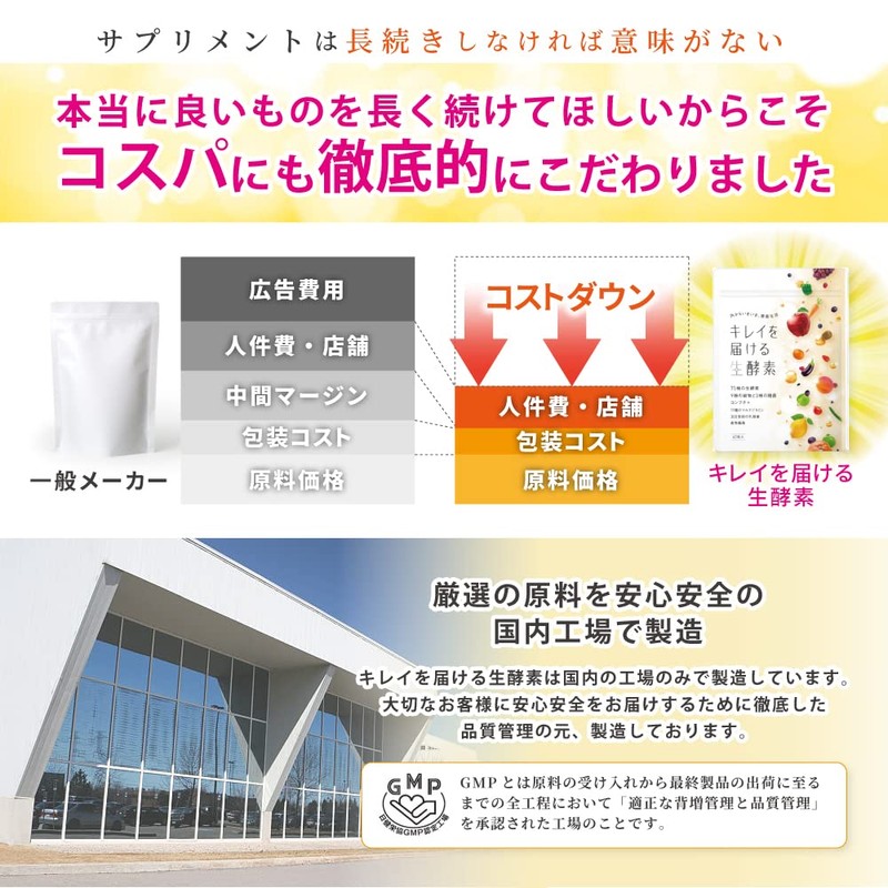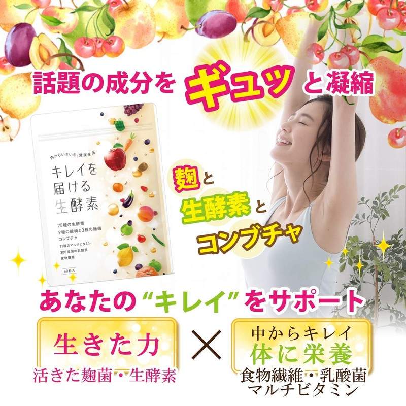 - ✅「キレイを届ける生酵素」は麹菌・生酵素・コンブチャ・食物繊維・乳酸菌・マルチビタミンなど話題の成分を贅沢配合。選ばれているのには理由があります。