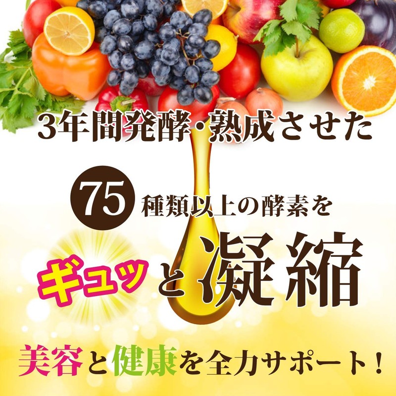 - ✅3年間発酵・熟成させた75種類の生酵素をギュッと凝縮。こんな方におススメ。「お肌の調子が良くない」「健康が気になる」「栄養のバランスが摂れていない」