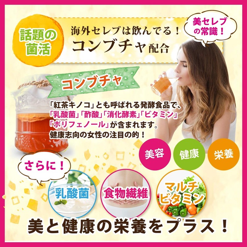 - ✅話題の成分「コンブチャ」を配合。美セレブの間では常識のコンブチャを配合 コンブチャには「乳酸菌」「消化酵素」「ポリフェノール」「ビタミン」「酢酸」が 含まれてます。