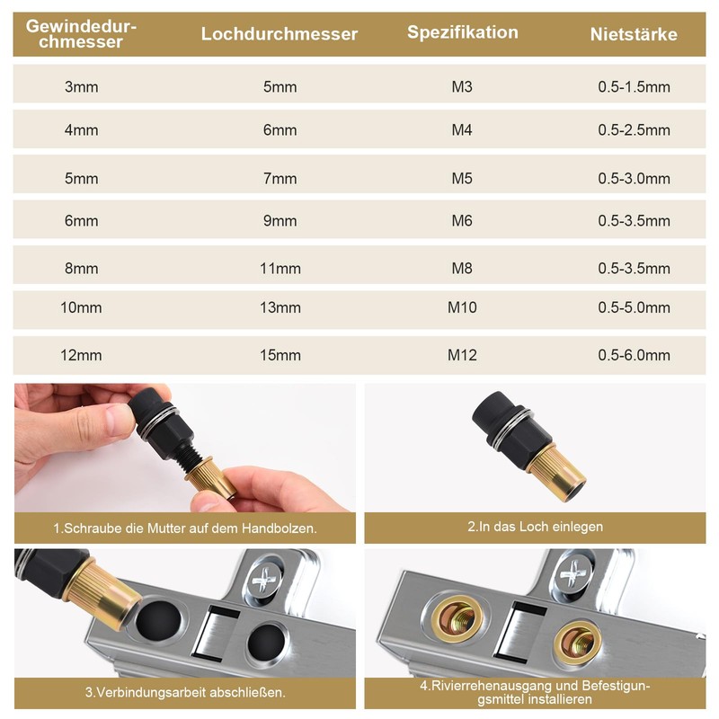 - 【Vollständiges Nietmutternzange Set】Unser Nietzangen Set enthält 7 hochwertige Nietkopf-Köpfe für die Größen M3, M4, M5, M6, M8, M10 und M12 sowie 70 passende Einpressmuttern (je 10 Stück pro Größe). Dieses Handnietwerkzeug Set ist ideal für Handwerker, Heimwerker und Profis, die eine zuverlässige Lösung für Nietarbeiten suchen. Mit diesem nietmutternzange Set sind Sie für alle gängigen Nietaufgaben bestens ausgerüstet – ob im Haushalt, in der Werkstatt oder auf der Baustelle.