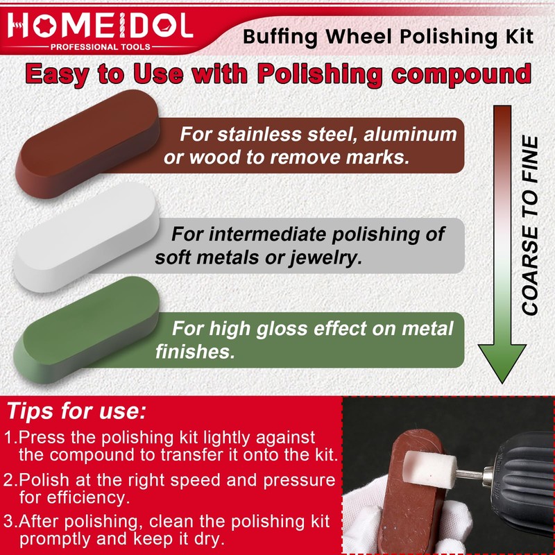 - √【Easy to Use with Polishing Compound】Buffing polishing wheel has different shapes and sizes. They are more efficient when used in combination with polishing compound. 3 polishing compound with different benefits. Brown is rougher for stainless steel, aluminum or wood to remove marks. White is for intermediate polishing of soft metals or jewelry. Green is used to give a high gloss effect on metal finishes