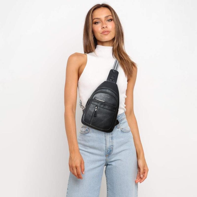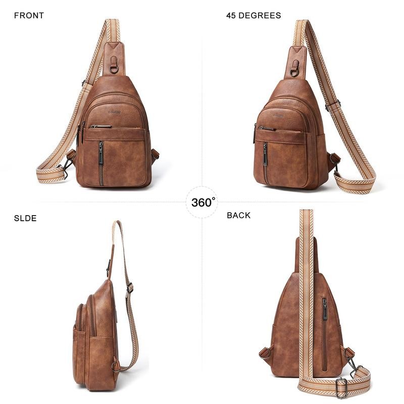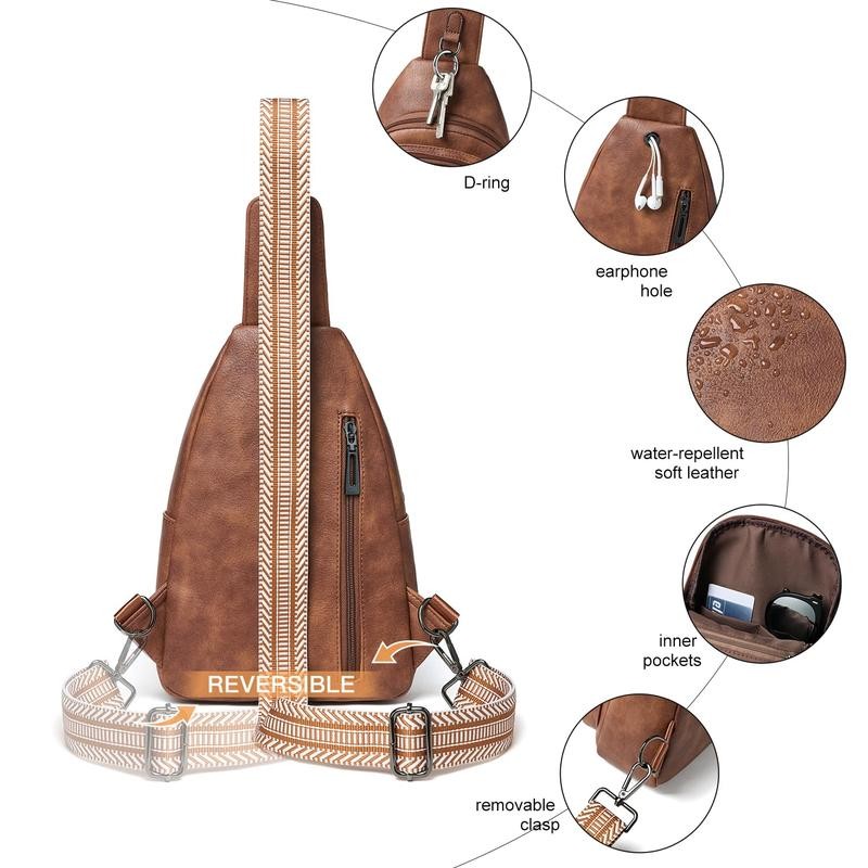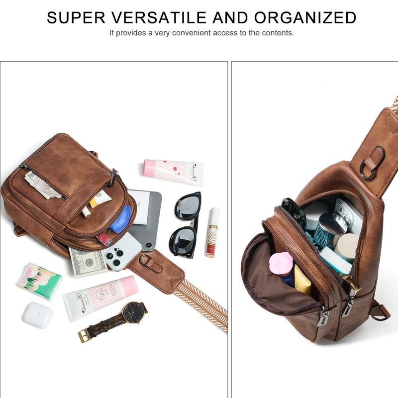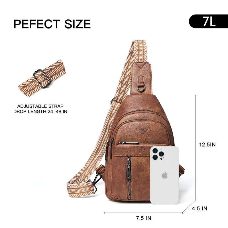 7L Sling Bag For Women Men Backpack Fanny Pack Crossbody Chest Travel Shoulder Women's Belt Bags Purse Handbag PU Leather Zipper Compact:_Black W/ Brown Trim