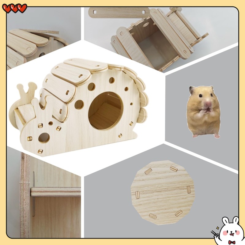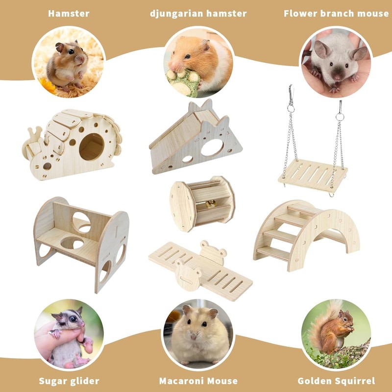 7pcs Hamster Toys Wooden Cage Accessories Include Snail House, Bell Toy, Seesaw Bridge, Slide House, Bridge,Dodge Toy, Swing and Exercise Toys for Hamster, Guinea Pig and Other Small Animals