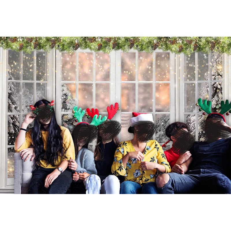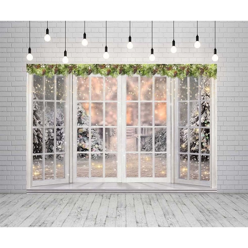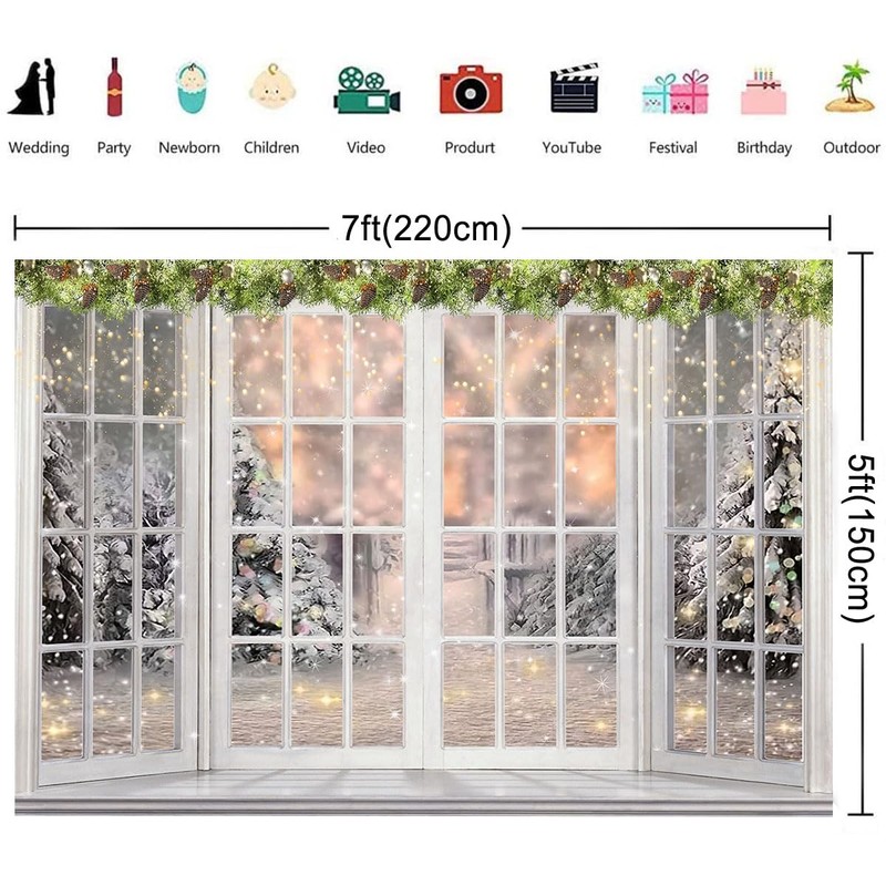 7X5ft Christmas Background White Window Background Outdoor Snow View Forest Backdrop for Christmas New Year Party Backdrop