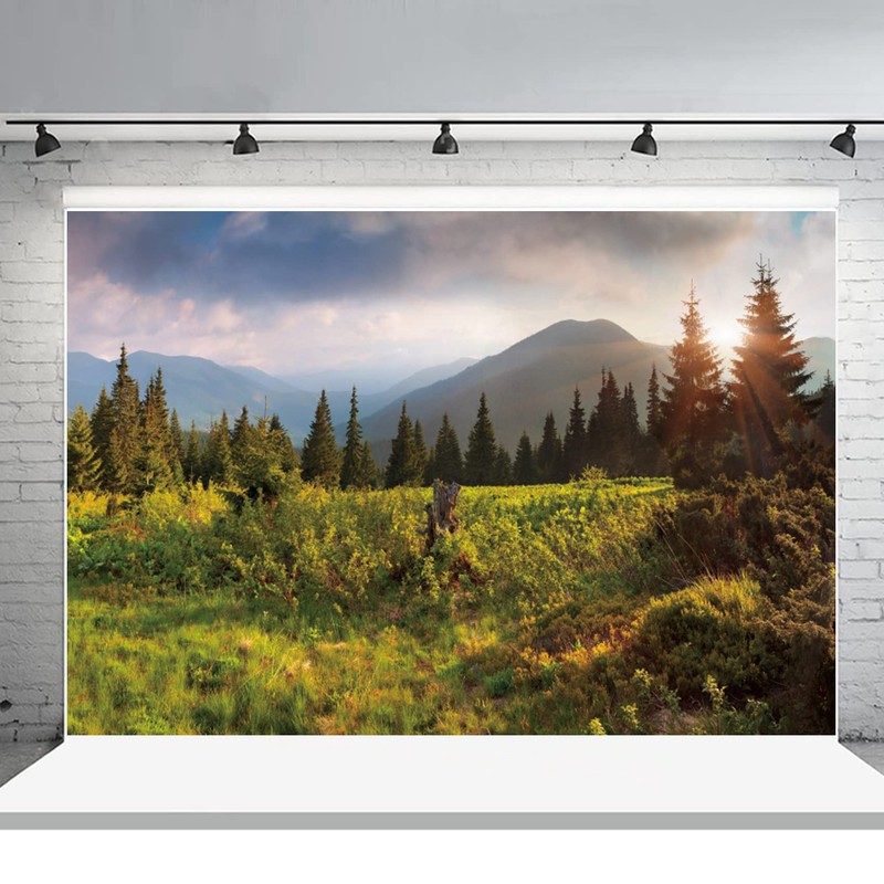 7x5ft Spring Natural Scenery Backdrop Mountains Trees Green Grass Jungle Photography Backdrop Sunshine Pine Tree Spring Vinyl Thin Photography Background for Photo Studio Props