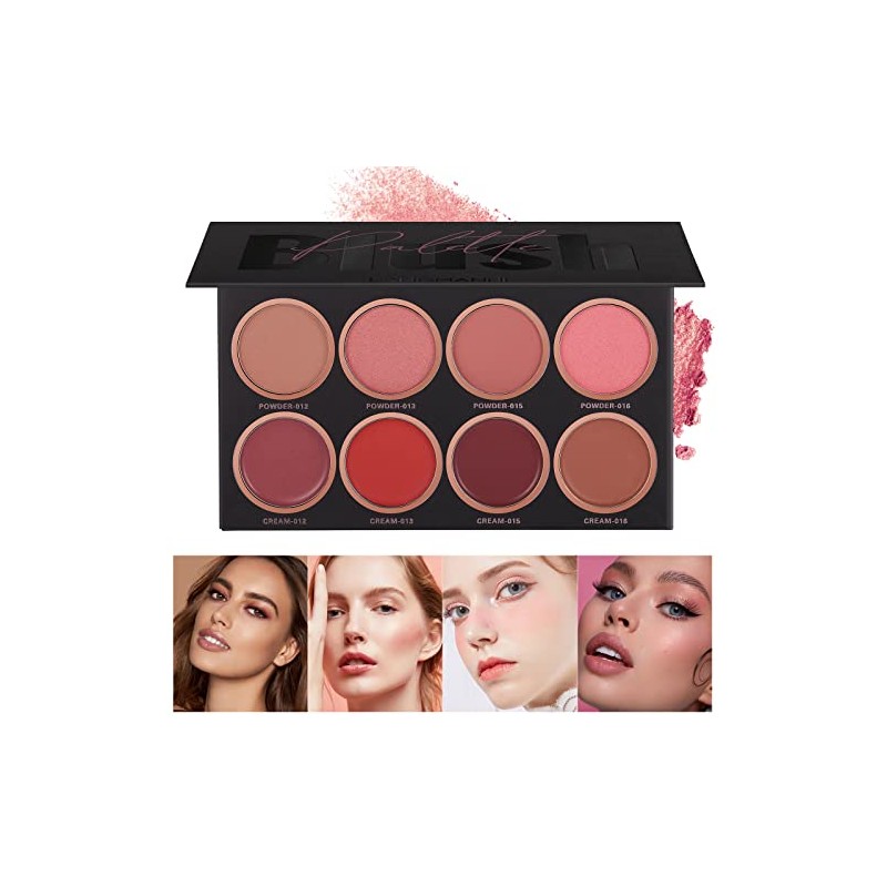 - [ 8-Color Blush Palette ] There are 8 colors in the blush palette, divided into 4 dry powders and 4 blush creams, with a variety of combinations that are easy to color, and intelligent color toning factors make the color rosy and translucent, and bring a natural matte effect to your skin tone.