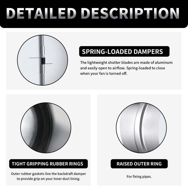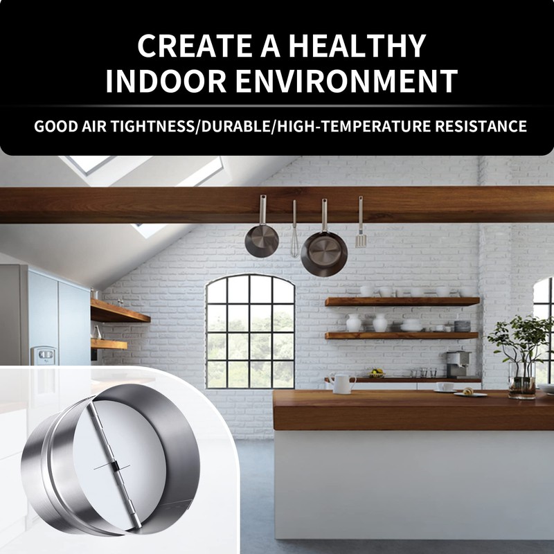 - 【Practical Features】The air duct choke prevents cold air or wind from entering the ventilation duct. The backflow flap opens and closes automatically at low air volumes. The valve is equipped with a smooth-running spring and a rubber gasket that create an airtight seal and grip between the damper and ducts