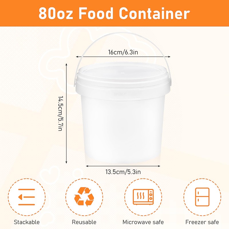 8 Pack 2.5 Quart Plastic Ice Cream Tub with Lid, Small Bucket with Handle, Food Grade Freezer Food Storage Containers, White