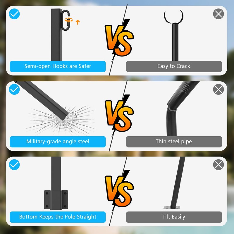 - Versatile Hanging System Engineered for ultimate adaptability Ground Mount: Includes sturdy fork base for secure soil/grass penetration perfect for gardens & lawns Surface Mount: Comes with adjustable brackets + hardware for decks/fences Whether it is light strips, banners, coloured flags, lanterns, small plants, glass bottles and other creative decorations, all of them can be hung securely The V-shaped head design ensures that each item is firmly locked in the appropriate position.