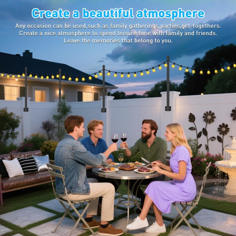 - VERSATILE & STYLISH DESIGN: These modern string light poles blend elegant aesthetics with multi-functional practicality, perfect for enhancing any indoor or outdoor space. The sleek black finish and minimalist silhouette effortlessly complement both contemporary and traditional decor, while adding a warm, romantic ambiance to:Private gardens, patios, courtyards, Family gatherings, wedding, restaurant terraces, holiday markets, festival lighting & temporary installations