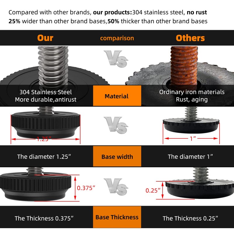 - More stable and durable: The base diameter of our adjustable furniture level is 1.2 inches, which is 20% larger than other brands, and the base height is 1/4", which is 20% higher than other brands, so this furniture legs leveler more stable and durable.