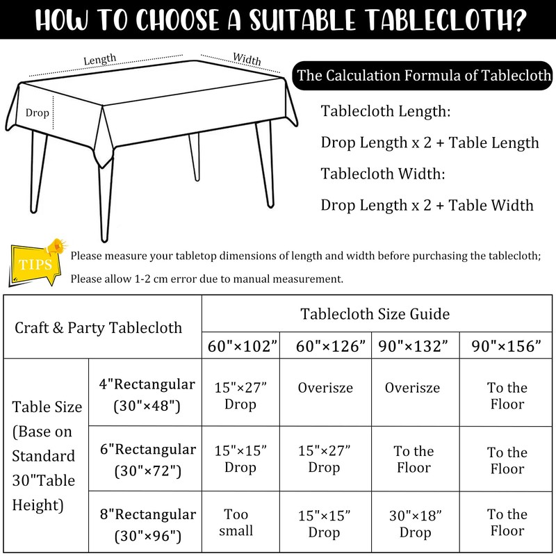 - Protect Your Table: these rectangular tabletop covers does not contain harmful chemicals and has no pungent odor, perfect to protect and decorate your tables. Give your plain and lackluster tables a fresh festive look with these premium quality tablecloths, easily protect your tables and furniture from scratches, stains and sun rays. In order to avoid buying the wrong size, please measure the table size before purchasing.