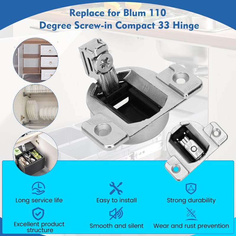 - Widely Applied: The hinges for cabinet doors can be applied to replace all cabinets that use blum 110 degree screw in compact 33 hinge, such as kitchen wall cabinets/floor cabinets, wardrobe sliding doors, and RVs. It makes your maintenance simple and says goodbye to the troubles of abnormal noise, door frame falling off, etc.