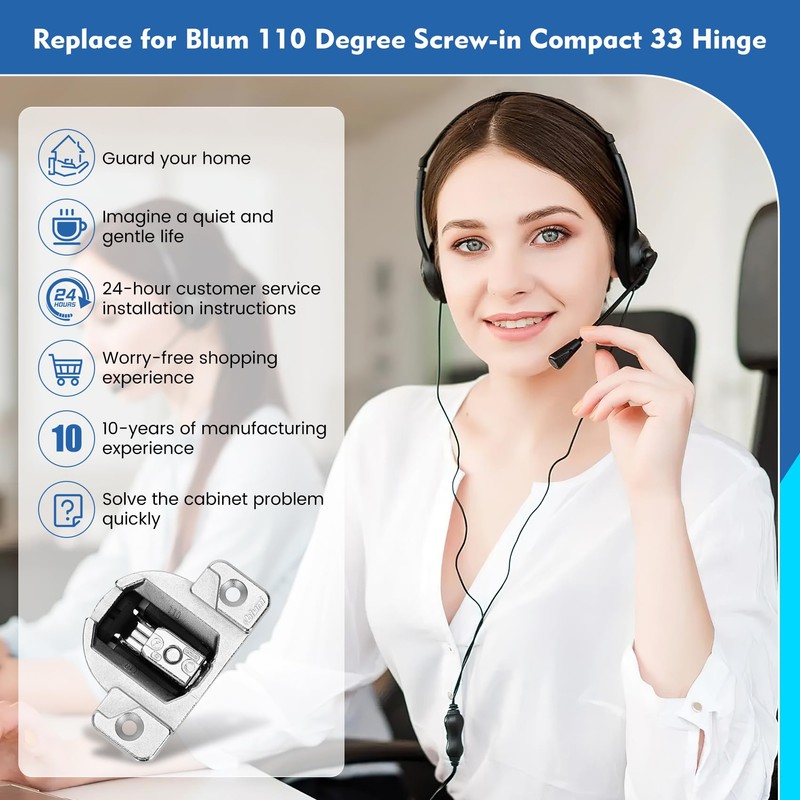 "Looking for a reliable substitute for your original Blum cabinet hinges? Our replacement hinge is specifically designed for the Blum 110 Degree Screw-in Compact 33 Hinge and is compatible with a wide range of part numbers, including 130.1100.24, 130.1100.23, 130.1110.02, 133.0240, and many more.Installation is a breeze with the 16 included screws. No need to search for additional hardware - simply grab a screwdriver and you can easily swap out your old hinges. The design closely matches the original Blum hinges, ensuring a seamless replacement process.Constructed from nickel-plated zinc alloy and high-density PA plastic, these hinges feature a robust and sophisticated structure. Built to withstand the rigors of daily use, they resist wear and tear, promising an extended service life. Whether you're opening and closing your cabinets multiple times a day or just using them occasionally, these hinges will hold up well.These hinges are designed for doors with a thickness of 16mm to 19mm (about 5/8"" to 3/4""). They install into a 35mm cup on the back of the cabinet door, which is 1/2"" deep. The hole distance, measured from the edge of the 35mm cup to the edge of the door, is precisely 1/8 inch. Please note that a mounting plate is not included with this product.With its wide application range, this hinge can replace the Blum 110 Degree Screw-in Compact 33 Hinge in various cabinets. It's perfect for kitchen wall cabinets, floor cabinets, wardrobe sliding doors, and even RVs. Say goodbye to common issues like abnormal noises and door frames coming loose - our hinges make cabinet maintenance straightforward and hassle-free. Upgrade your cabinets today with our high-quality Blum hinge replacement!"