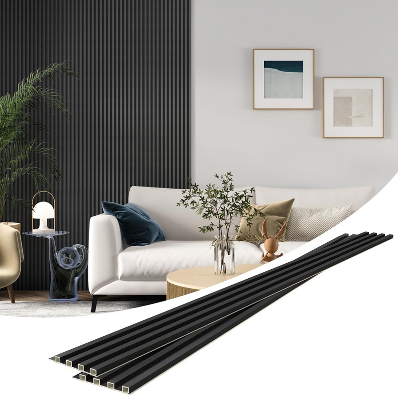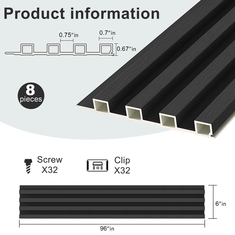 8 Pack Slat Wall Panels, WPC Soundproof 3D Wall Panel for Interior Wall Decor, 96 x 6 in (Black)