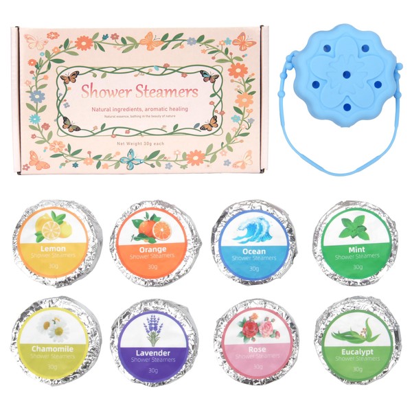 - 📍【What You Get】You can get 8 shower steamers with 1 blue shower steamer hanger, eliminating the hassle of searching for compatible storage. Everything you need for an elevated shower experience comes in one box—ready to use right out of the package.