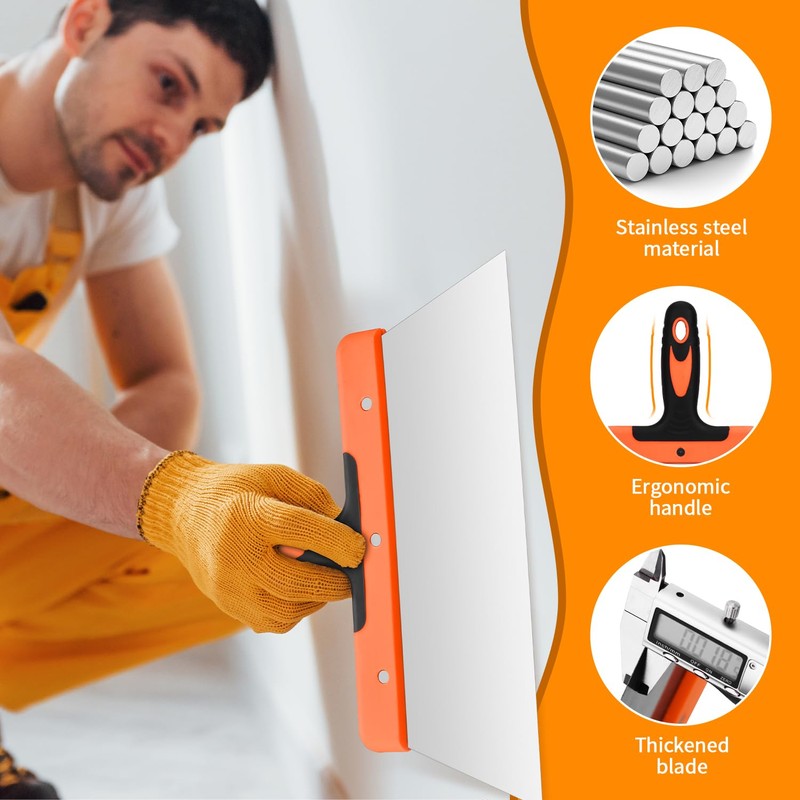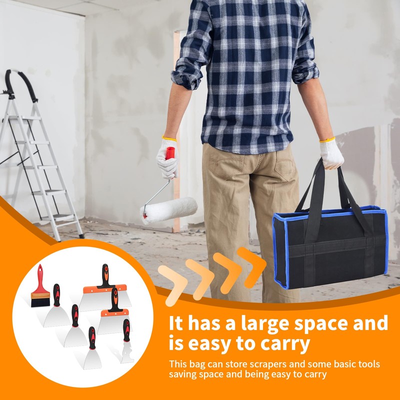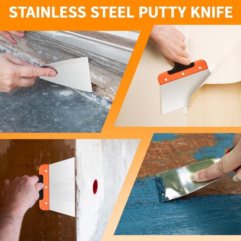 • Stainless Steel Painting Tool Set: Designed for drywall work, it contains 3-inch, 4-inch, 5-inch, 6-inch, 8-inch, and 12-inch paint scrapers, a 4-inch brush, and comes with a tool carrying bag.