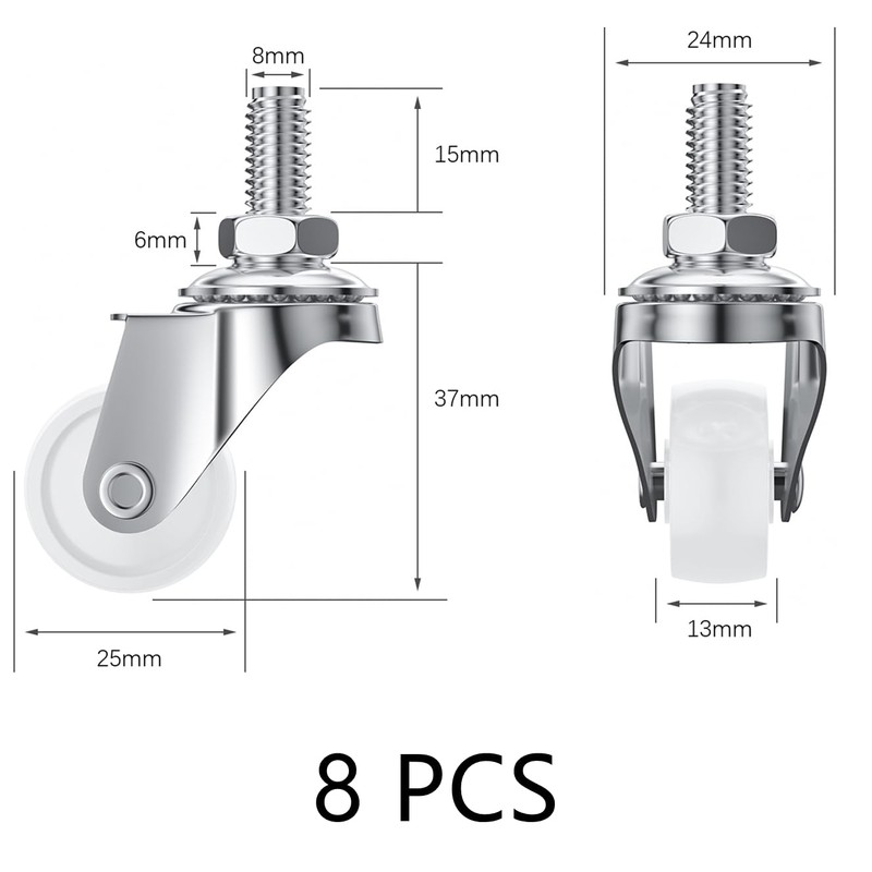 • 【Quantity and Size】: There are 8 pieces of M8 swivel stem casters in the set, whose diameter: is 25mm. The color is white. The size of screw stem is M8*15mm.