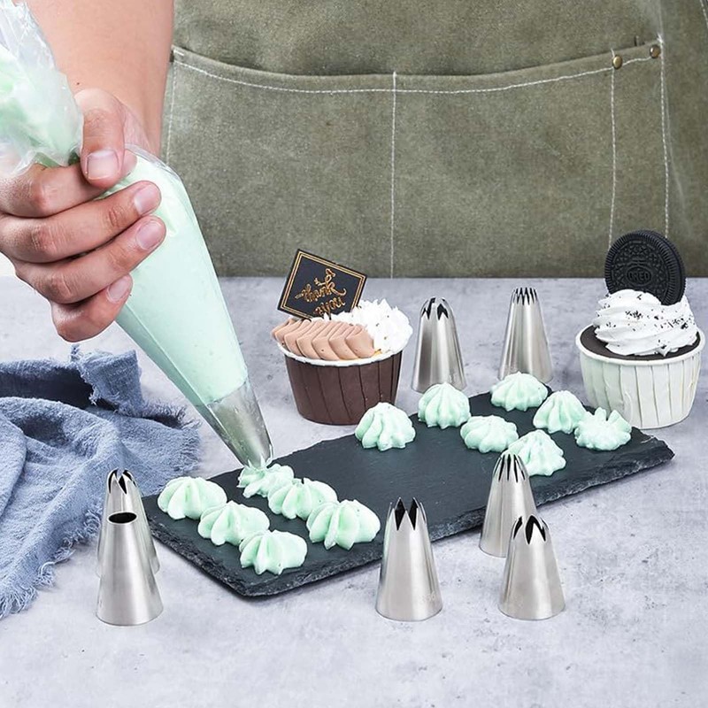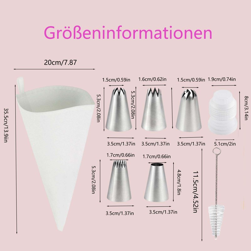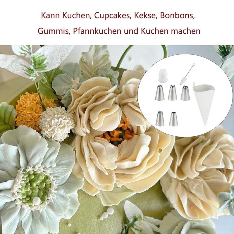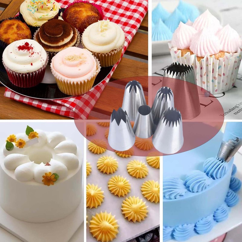 - Piping nozzle set: 5 stainless steel piping nozzles, 1 large cotton piping bag (35.5 cm), 1 coupling, 1 brush to meet your requirements for making different patterns on the cake. The different shapes allow you to create creative and detailed decorations on cakes and cupcakes.