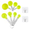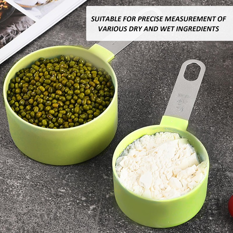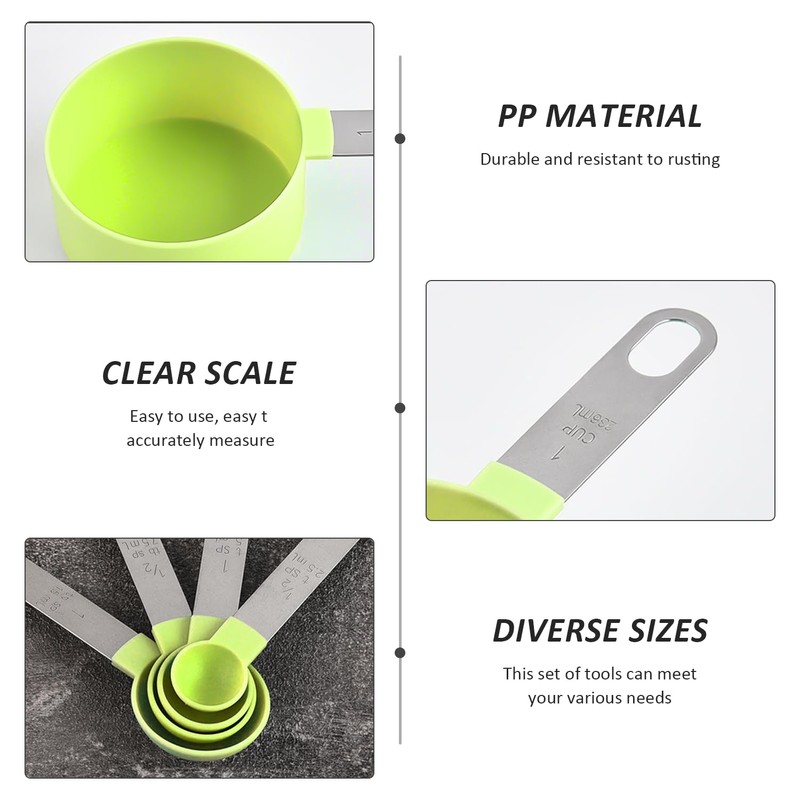 - [Product content]: you will receive 8 stainless steel + PP measuring cup measuring spoon sets, the sizes are 16.8 x 9.2 cm, 15 x 7.2 cm, 14.1 x 6.2 cm, 13.3 x 5.3 cm, 12 x 4.2 cm, 10.8 x 3.3 cm, 10.7 x 2.8 cm, 10.7 x 2.8 cm. 10,1**2.3 cm² transparent acrylic hooks. 4 each measuring cups and measuring spoons, the color is green, suitable for baking and cooking.