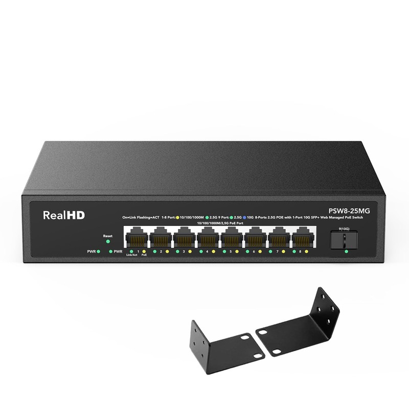 - 【9 Port 2.5G PoE Switch】9 ports 2.5G PoE Switch with 8 x 2.5Gb PoE ports + 10G SFP uplinks, 10G SFPs can provide more rate and connect to different devices such as WiFi6 Router, NVR, PoE Camera.