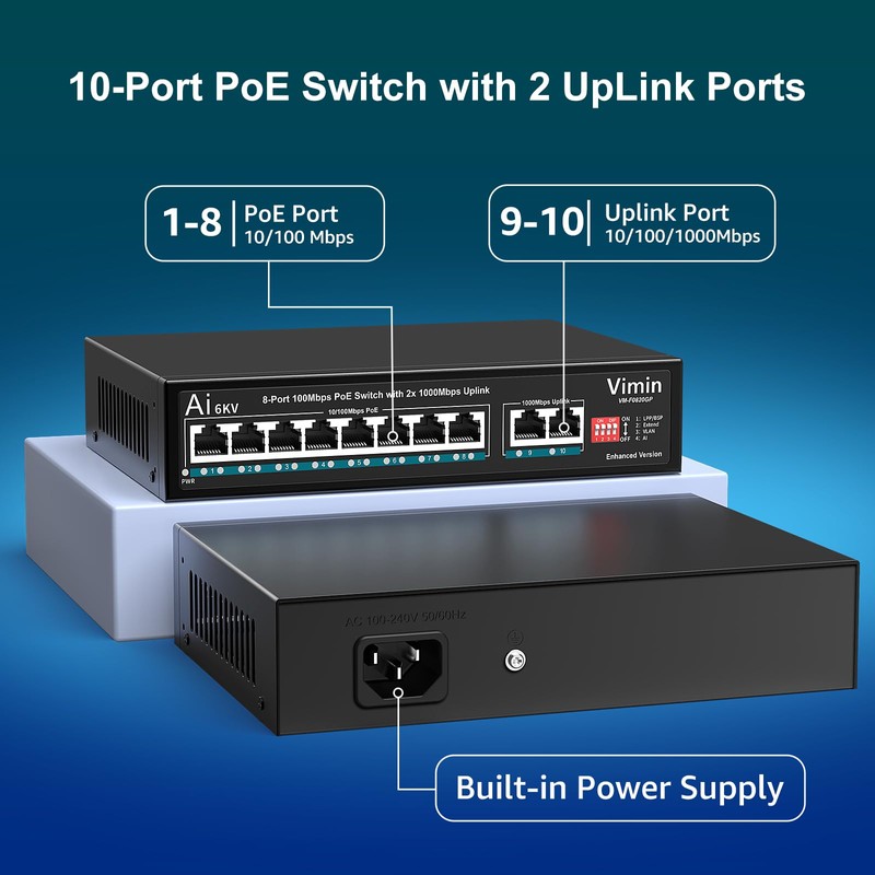 - 🌟8x PoE Ports & 2x 1000Mbps Uplink Ports - 10 port network PoE switch with 8 Port PoE+ 10/100 Mbps RJ45 ports and 2 gigabit uplink ports. This switch offers 8 high-speed PoE+ ports for data transmission and power delivery over the network cable, compatible with routers, wireless APs, cameras and more. Besides, along with 2* 1000Mbps uplink ports for connecting to NVRs, the internet and more.