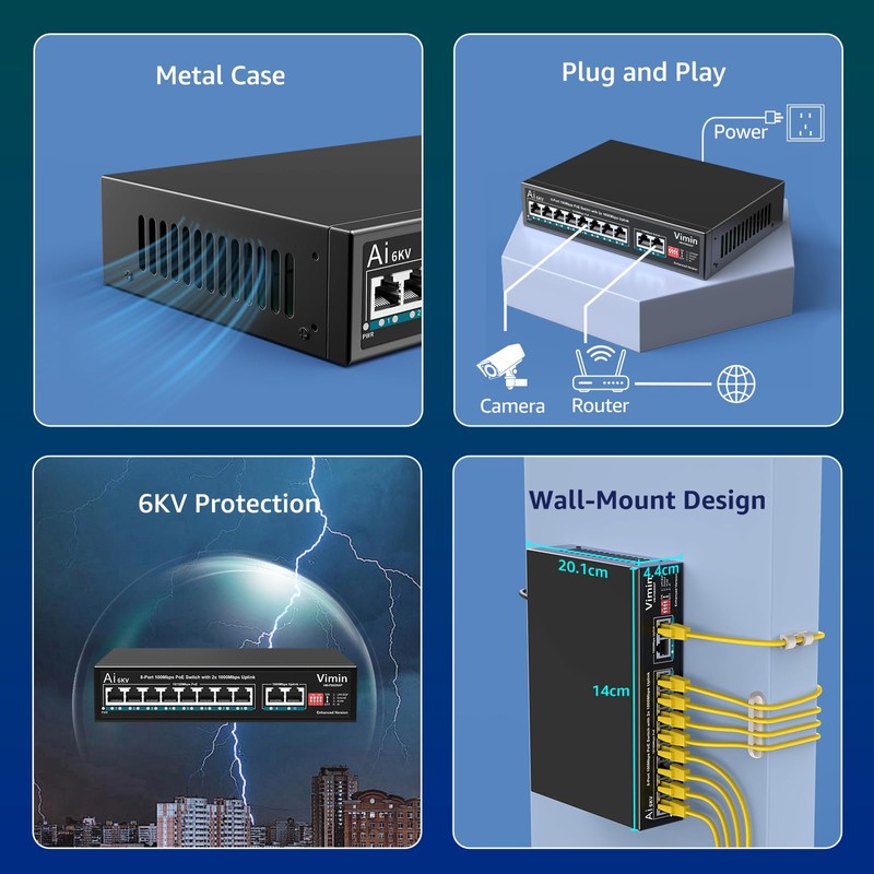 - 🌟Robust Protection - The VIMIN PoE Ethernet switch hub is equipped with 4KV lightning protection, safeguarding both the switch and connected devices against voltage spikes. This feature ensures reliable and uninterrupted network performance, even in challenging environments.