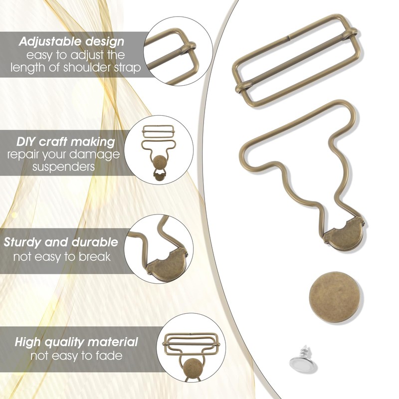 - overall button replacement is easy to use: These metal suspender buckles are easy to fix. Just slide the strap from one side of the middle rod to the other side and fix the two ends with rivets