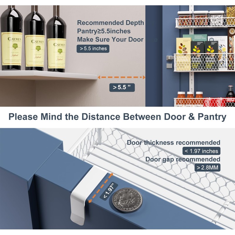 - Note Before Purchasing: Please ensure the width of the door is greater than 15.7 inch(40cm) excluding the handle. Ensure enough space in your pantry >5.6 inch.