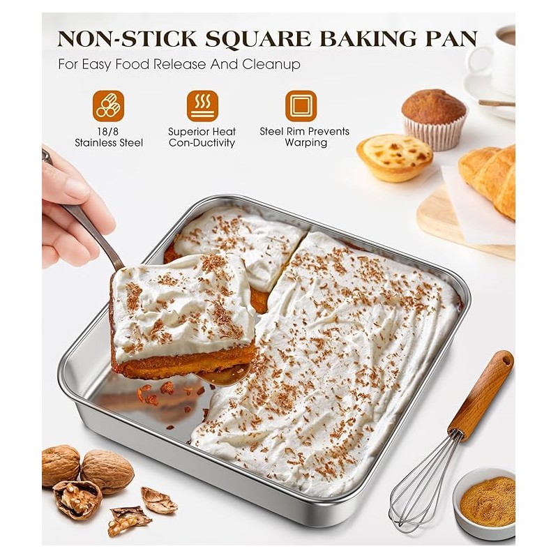 - Newly Upgraded 304 Stainless Steel Material: Our 8x8 baking pan is made of newly upgraded food grade 18/8 stainless steel material without aluminum or any toxic chemical substance, No worry about coating chip off or the toxic material leaching into your food, Superior to aluminum or nonstick pan. Premium and sturdy material not easy to break and deform, Rust proof square cake pan durable for year to come. Healthy for everyday home use and professional heavy production use.